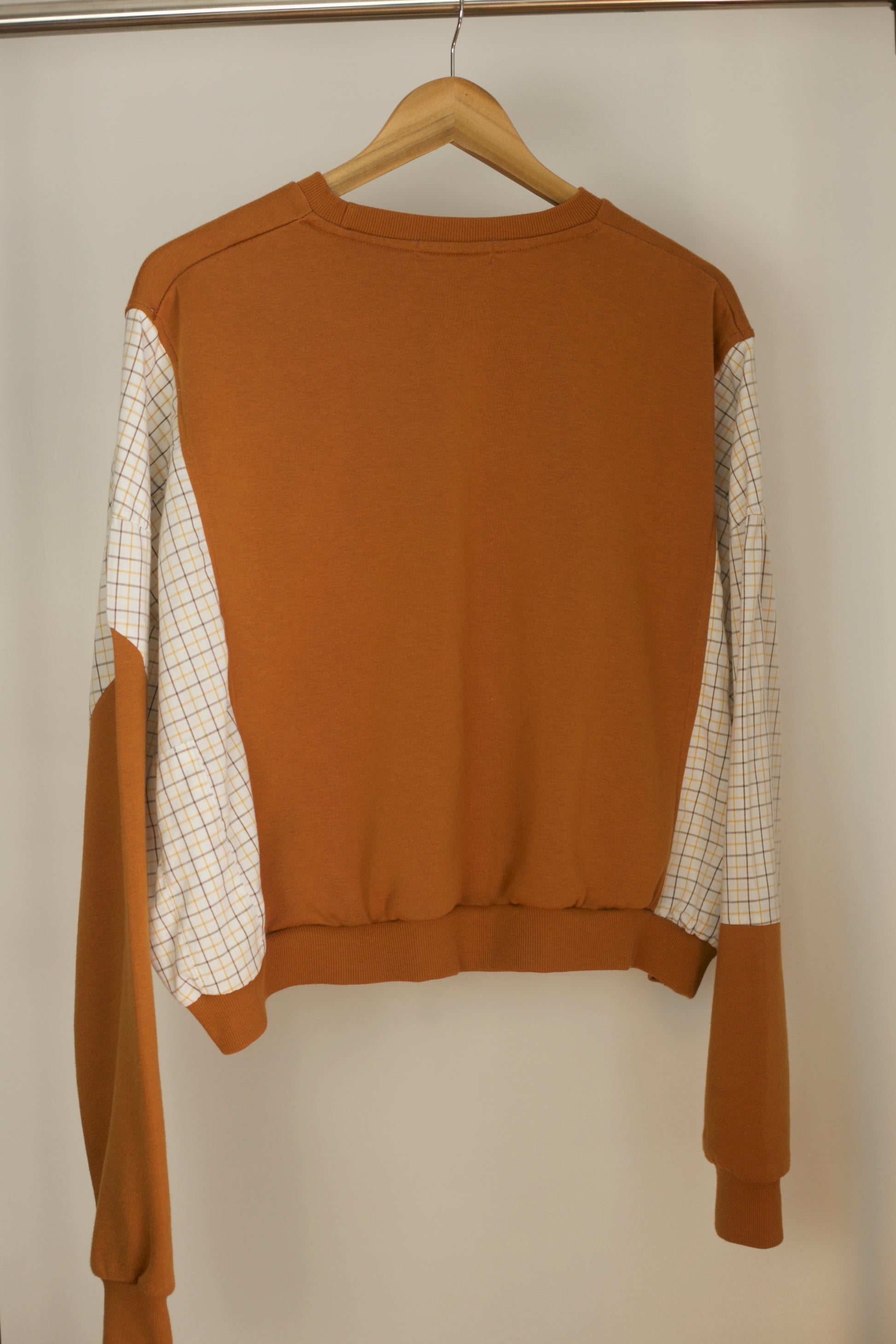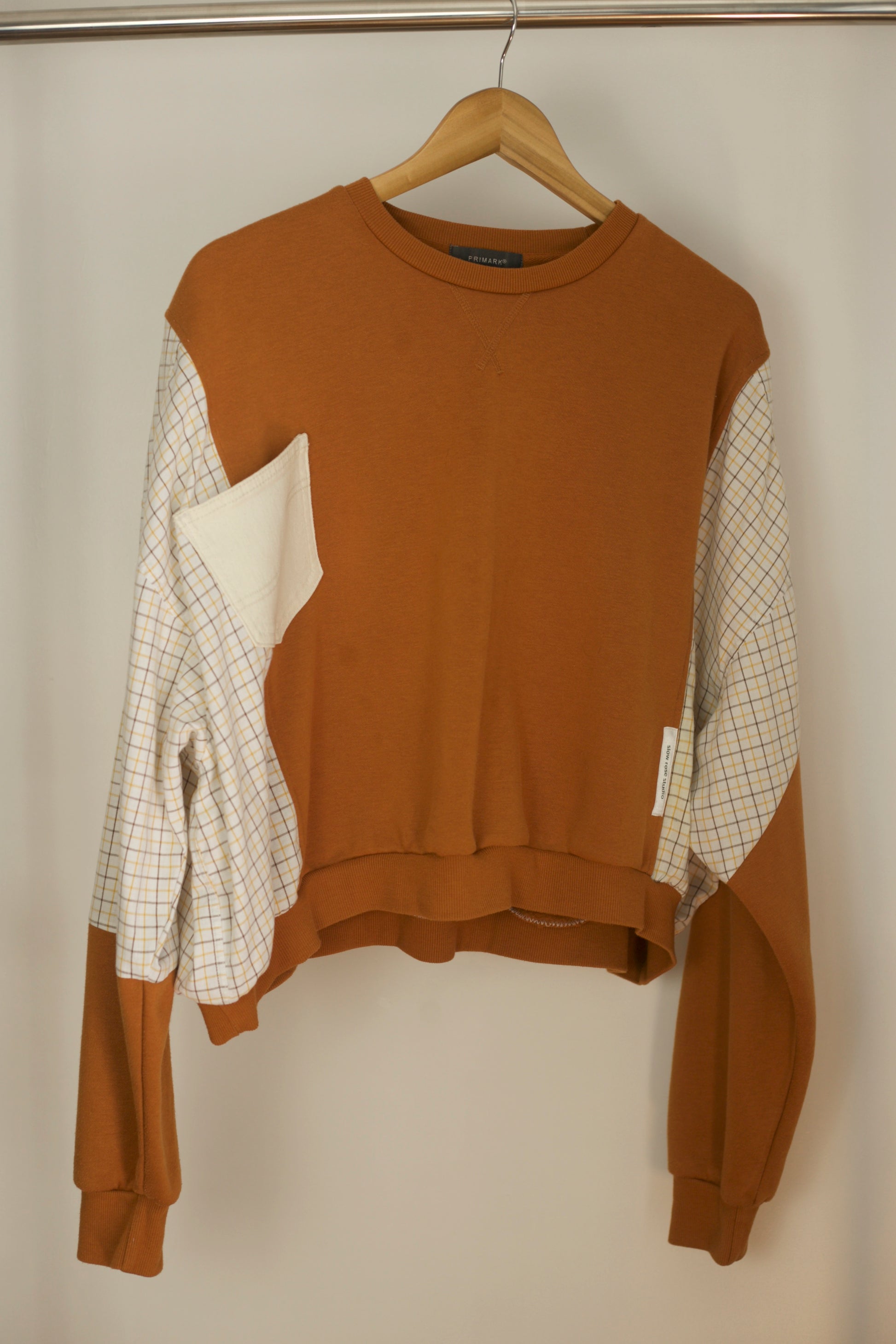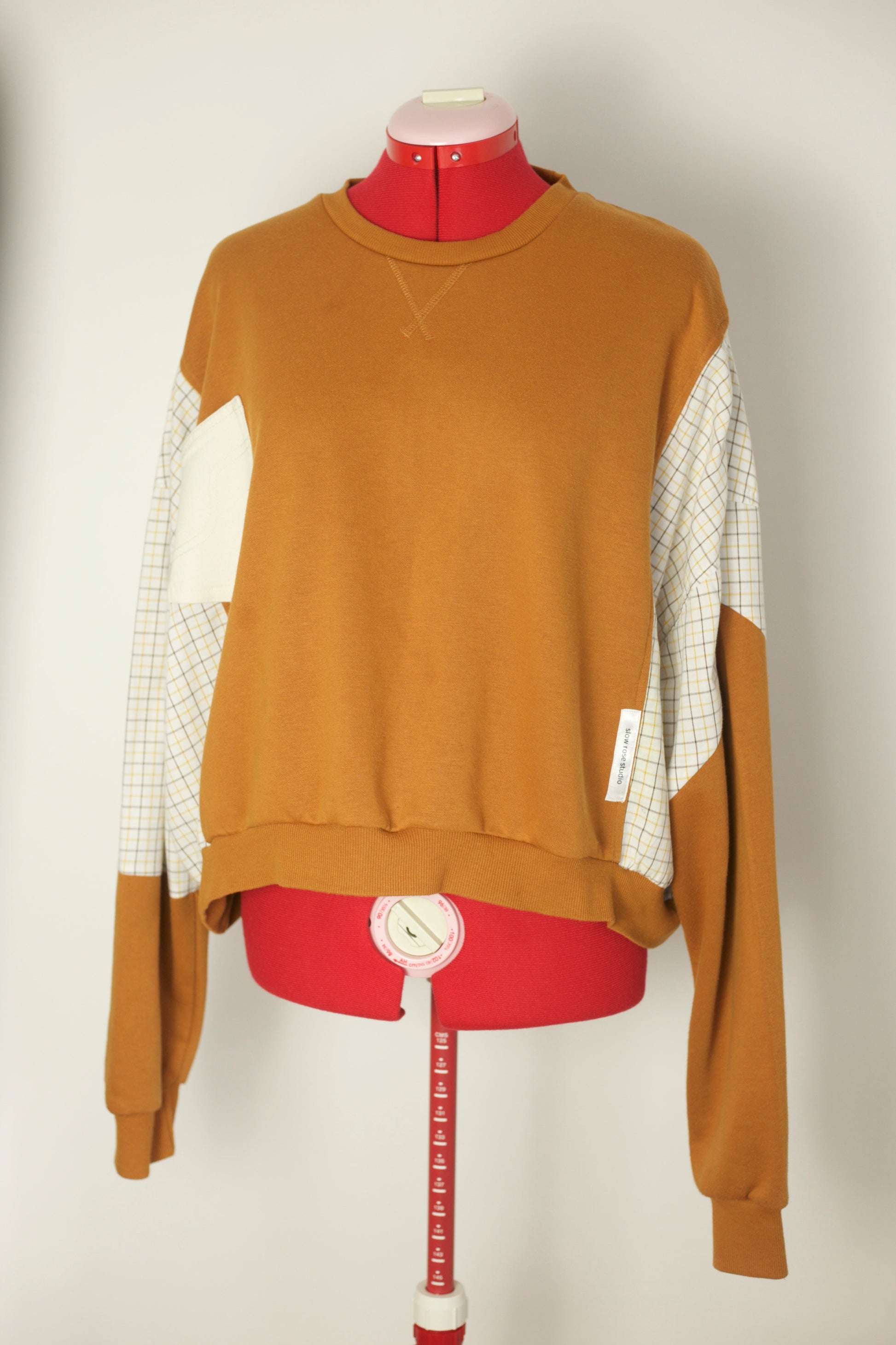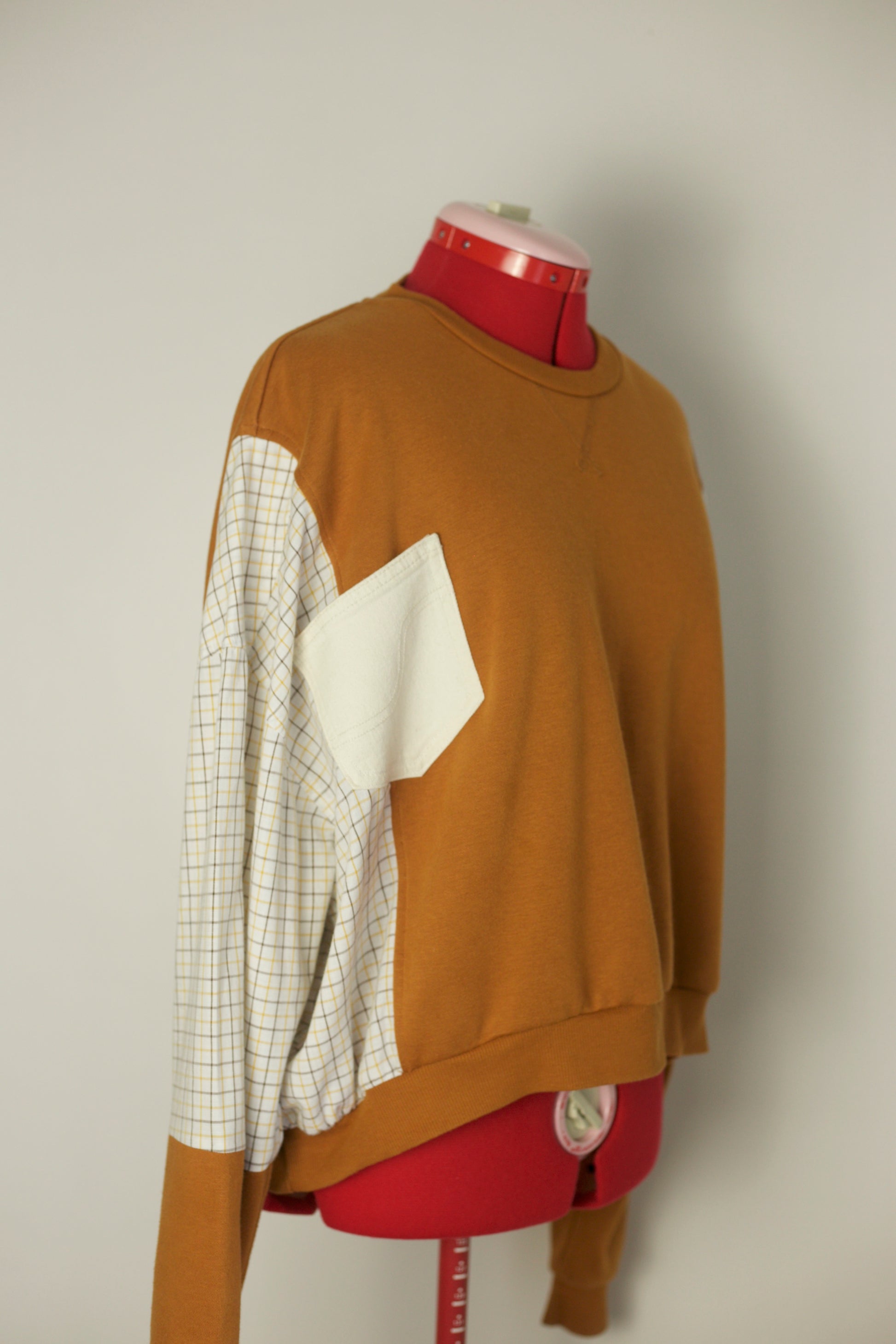 The Pumpkin Spice jumper has been made sustainably from secondhand clothing - specifically a shirt, a sweater and a denim jean pocket. These reclaimed textiles come together to make this one of a kind garment.