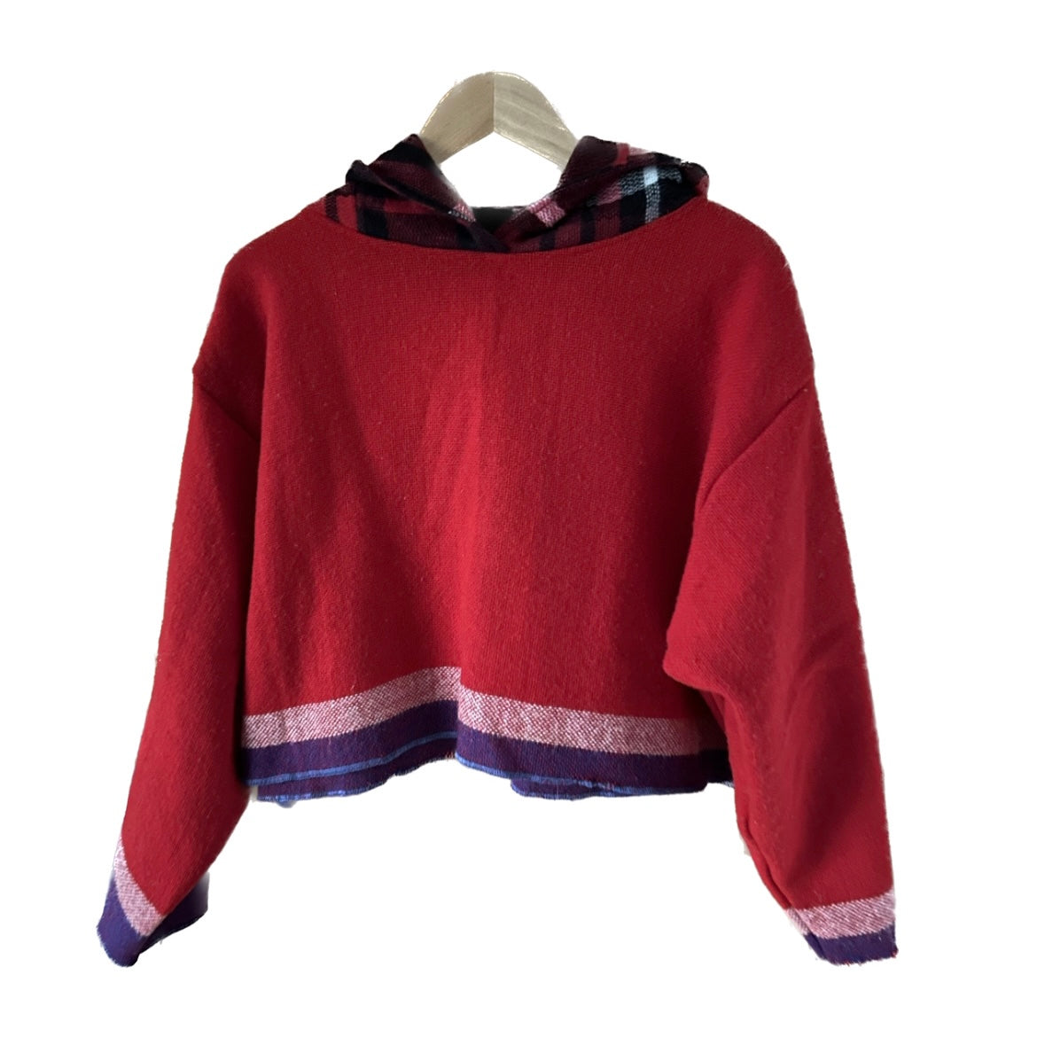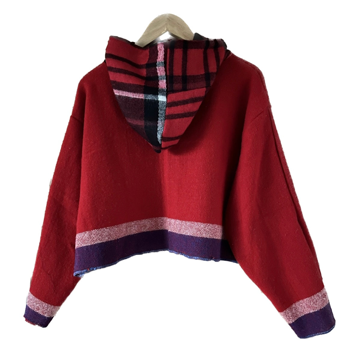 Reworked Red Blanket Hoodie has been sustainably made from an upcycled blanket (body) and scrap scarf materials (hood). These reclaimed textiles come together to make this one of a kind garment and also helps make my studio minimal waste by using scrap materials.